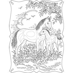 Embroidery flowers in lazy daisy stitch with french knot centers, leaves in lazy daisy stitch, and stems in outline stitch. Work larger leaves in satin stitch and ferns in fern stitch. Do grass in long and short stitch. Work water in long and short stitch and bushes in outline stitch, branches of tree in satin stitch and leaves in lazy daisy stitch. Outline clouds in medium blue, and work inner line of clouds in yellow. Make upper part of sky coloring in light blue running stitch and lower part (surrounding mare) in a blend of light blue, yellow and a bit of orange to resemble a sunset.