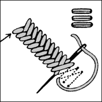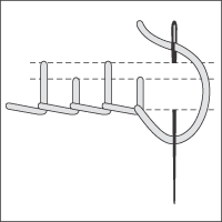Similar in effect to Closed Herringbone. May be worked with more space between the stitches. Bring the needle up from the back of the fabric and insert it to the left and but slightly lower. Bring the needle up to the right and just below the beginning of the first stitch. Continue to end. Used to make a solid line or border.